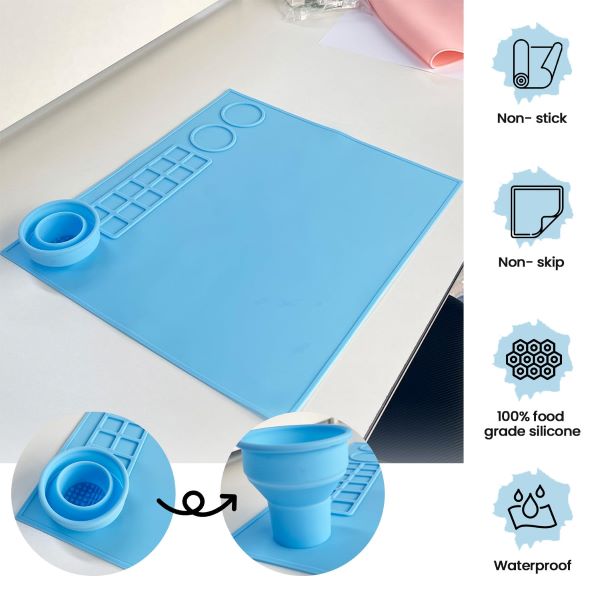 Táto vodotesná, nepriľnavá a protišmyková podložka, vyrobená zo 100 % potravinárskeho silikónu, je ideálna na všetky vaše remeselné potreby. Vďaka 14 jamkám a miešacej ploche je ideálna na organizovanie vašich potrieb.